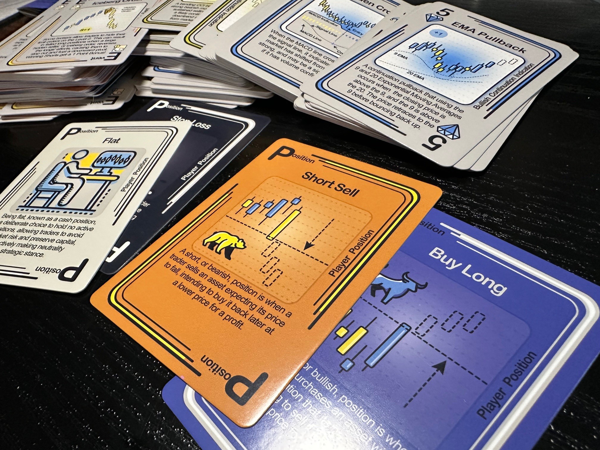 Every card features trading-themed designs and terminology, helping players learn basic market ideas in a casual, visual way.